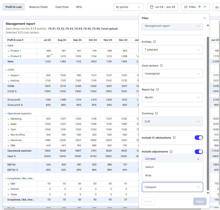 Next to wide reporting columns, a new option is now available that displays the table in a more compact format. This will allow you to show more data in a single view. To prevent overflow of columns, consider switching to displaying values in thousands (Setup > Admin)